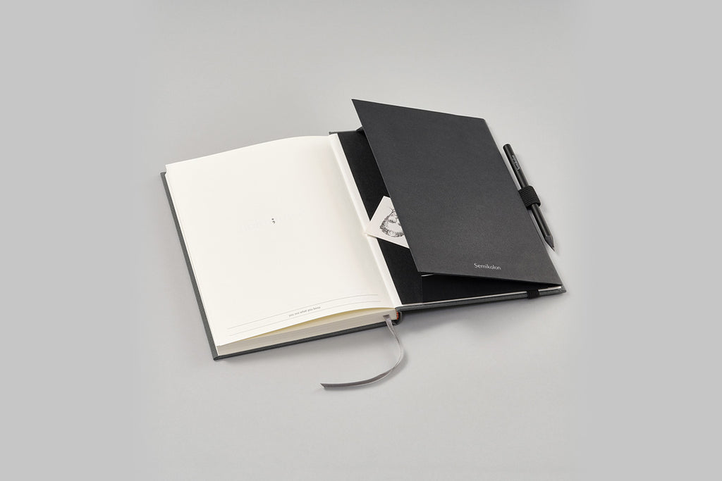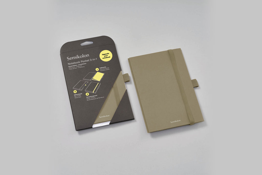 Upgrade your SEMIKOLON Notebook with their adhesive Patch Pocket! Made of durable paper combined with a side fold in coloured book linen, it provides added storage for loose papers and cards in the notebook of your choice. The Patch Pocket also comes with an elastic band for keeping your notebook closed when traveling, as well as a pen holder.