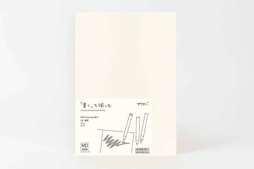 The MD Thick notebook is made from MD Thick Paper, the very same paper that is used for the flyleaf of the bestselling standard notebook. This paper retains the writing comfort of the classic MD PAPER, but is also more effective in capturing ink from water-based or brush pens, even when adding layers or intricate details. It's bound in Codex style, allowing it to lay completely flat from start to finish.